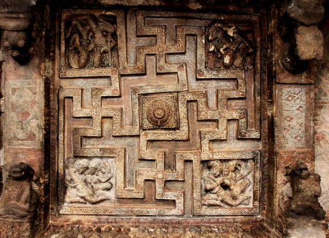 This is the only Jain temple in complex and the newest cave in complex, made in the late 6th century – 7th century AD. It is located higher than other caves. If compared to the three previous caves, this cave is less elaborate and smaller – but still beautiful and rich with adornment. It contains carving of the Tirthankara Parshavnatha with a serpent at his feet. Here is located also sculpture of Jain saint Mahavira in seated pose (often mistaken for Buddha) and standing Gomatesvara with creepers twisted around his legs.