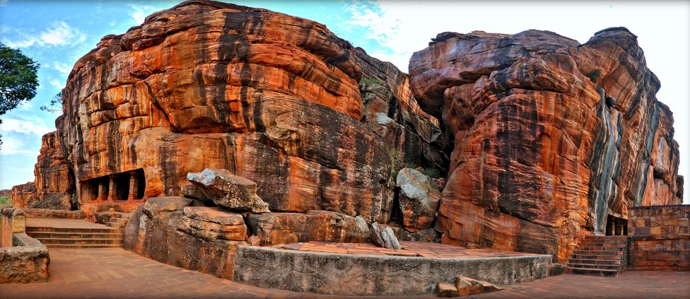The town of Badami in India lies at the mouth of a ravine with rocky hills on either side. The cave temples are carved out of the soft sandstone of these hill cliffs.