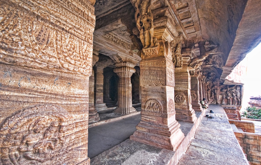 The first cave has gigantic carvings of Ardhanareeswara and Harira manifestations of Shiva in bas relief. It is made of red sandstone and has a hall with numerous pillars and a square shaped sanctum hollowed in the control back wall.