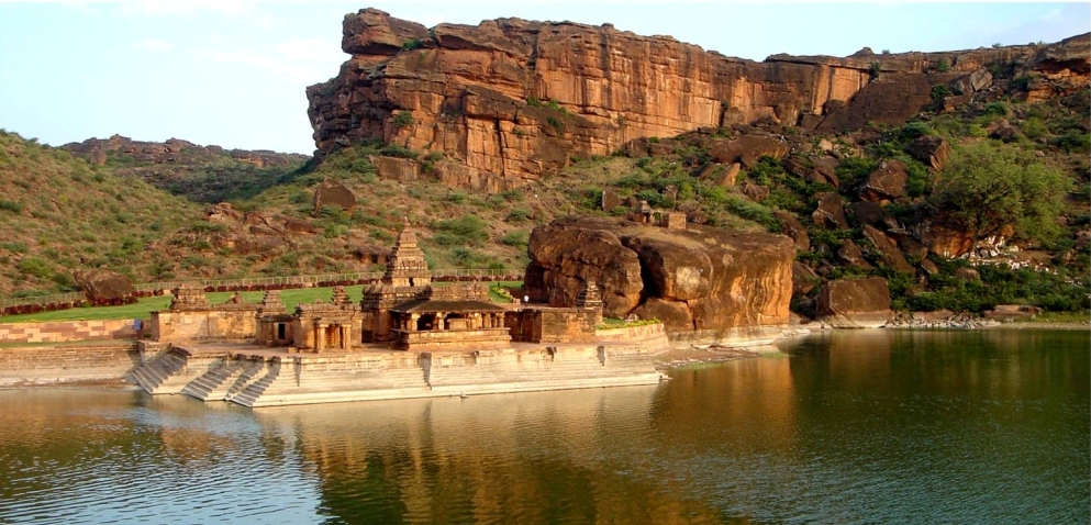 In totality, there are four cave temples in Badami – all carved out of sand stone on the precipice of a hill. They all share the same plan – a veranda with columns and brackets leading to a main hall, the pillared maha mandapa which in turn leads to the small sanctum which houses the sculpture. There are many beautiful murals as well. At the cutting edge, one can see a reservoir that makes a perfect foreground to these architectural structures.